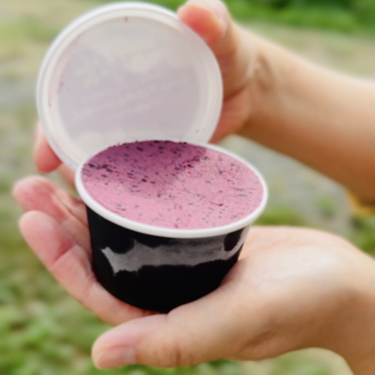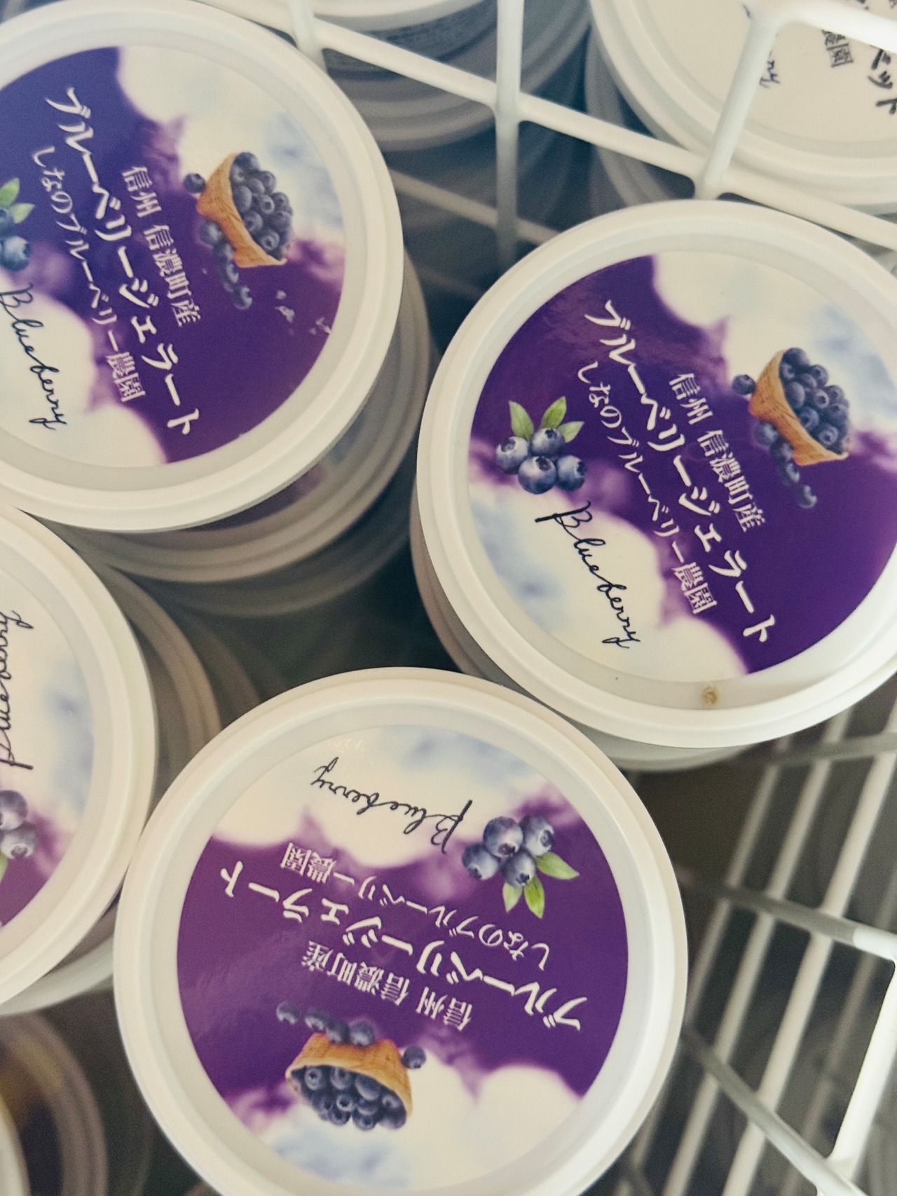 - ブルーベリー(長野県信濃町産)、生クリーム、牛乳、砂糖、脱脂粉乳、トレハロース、水あめ、レモン汁/安定剤(増粘多糖類)